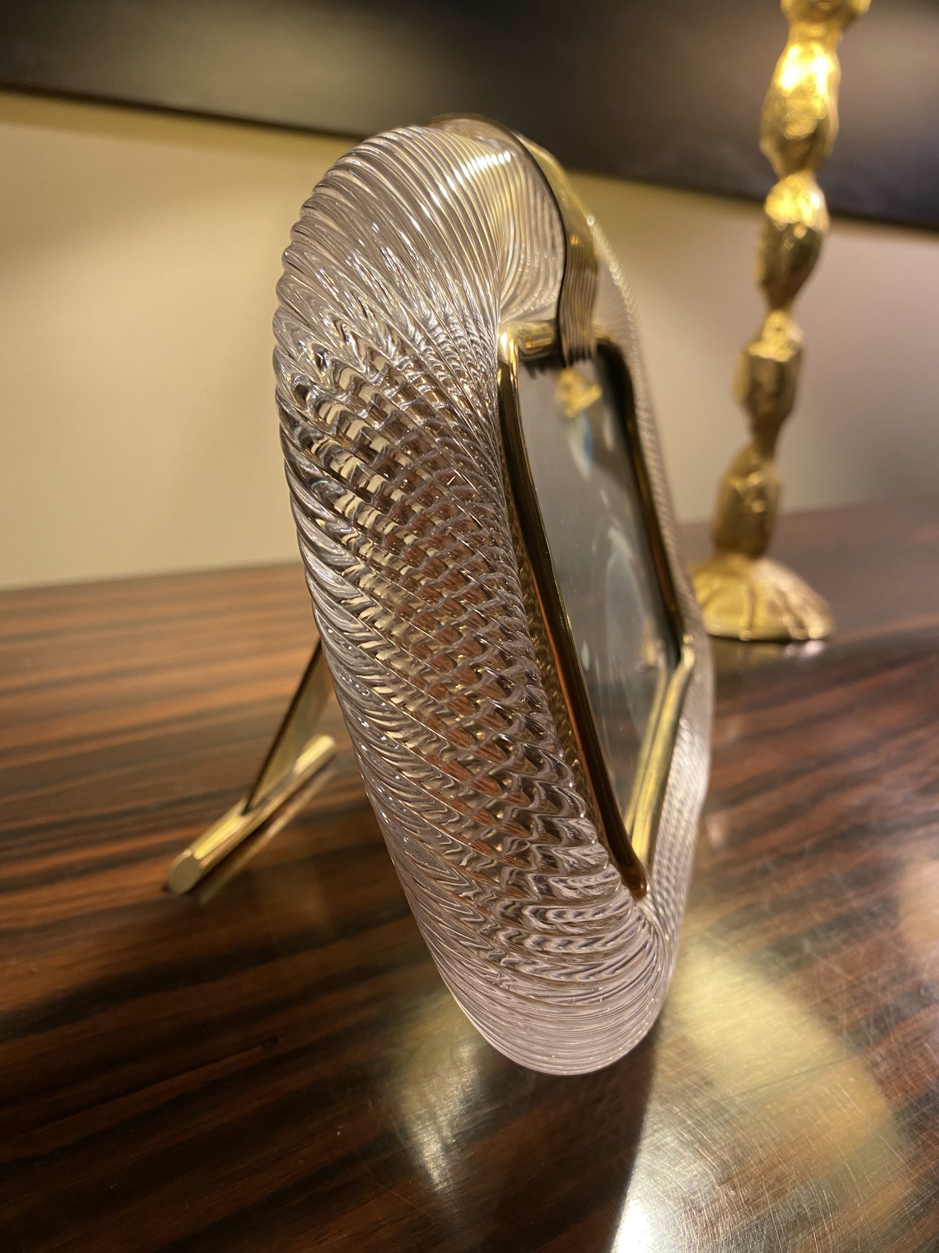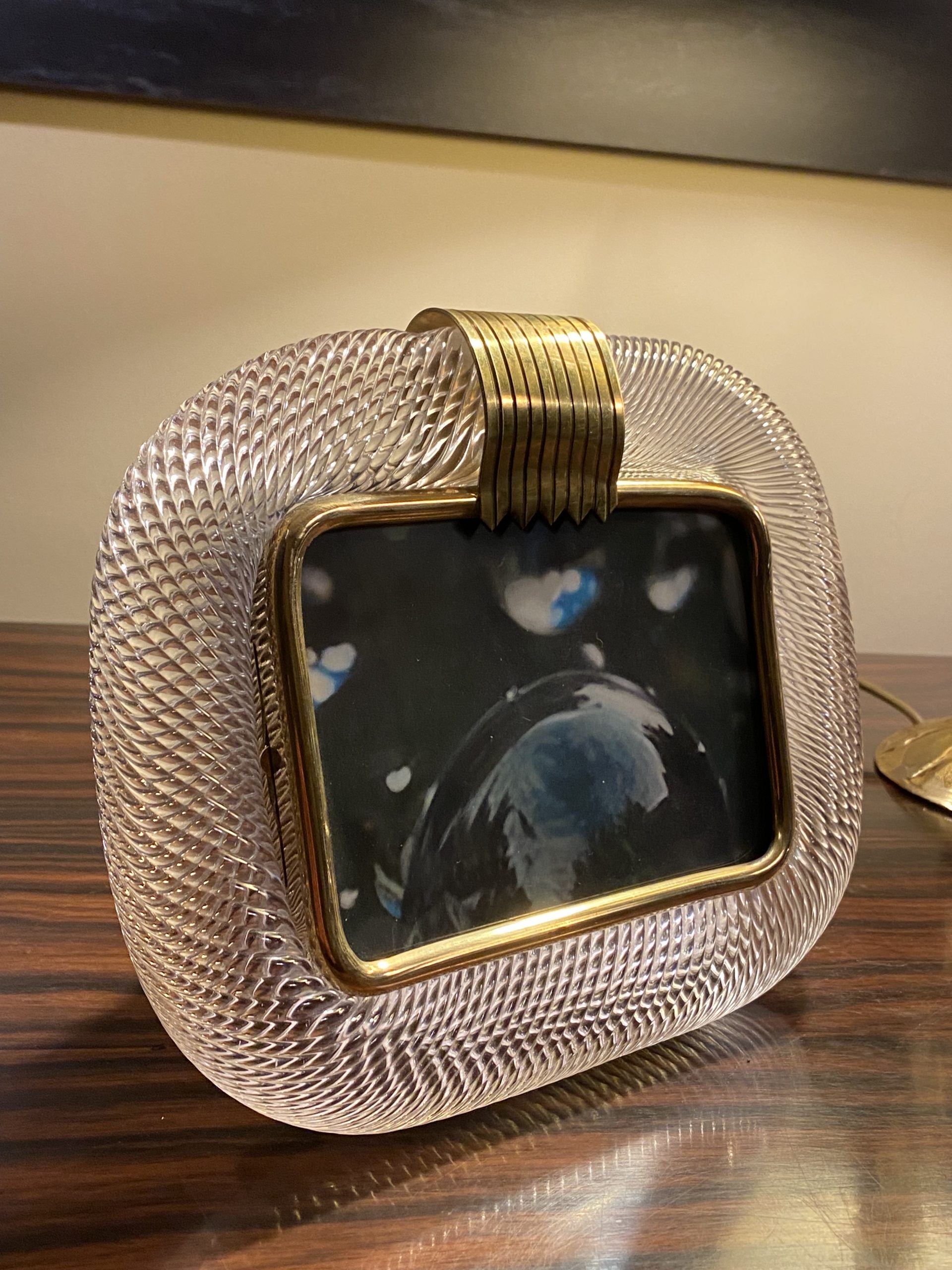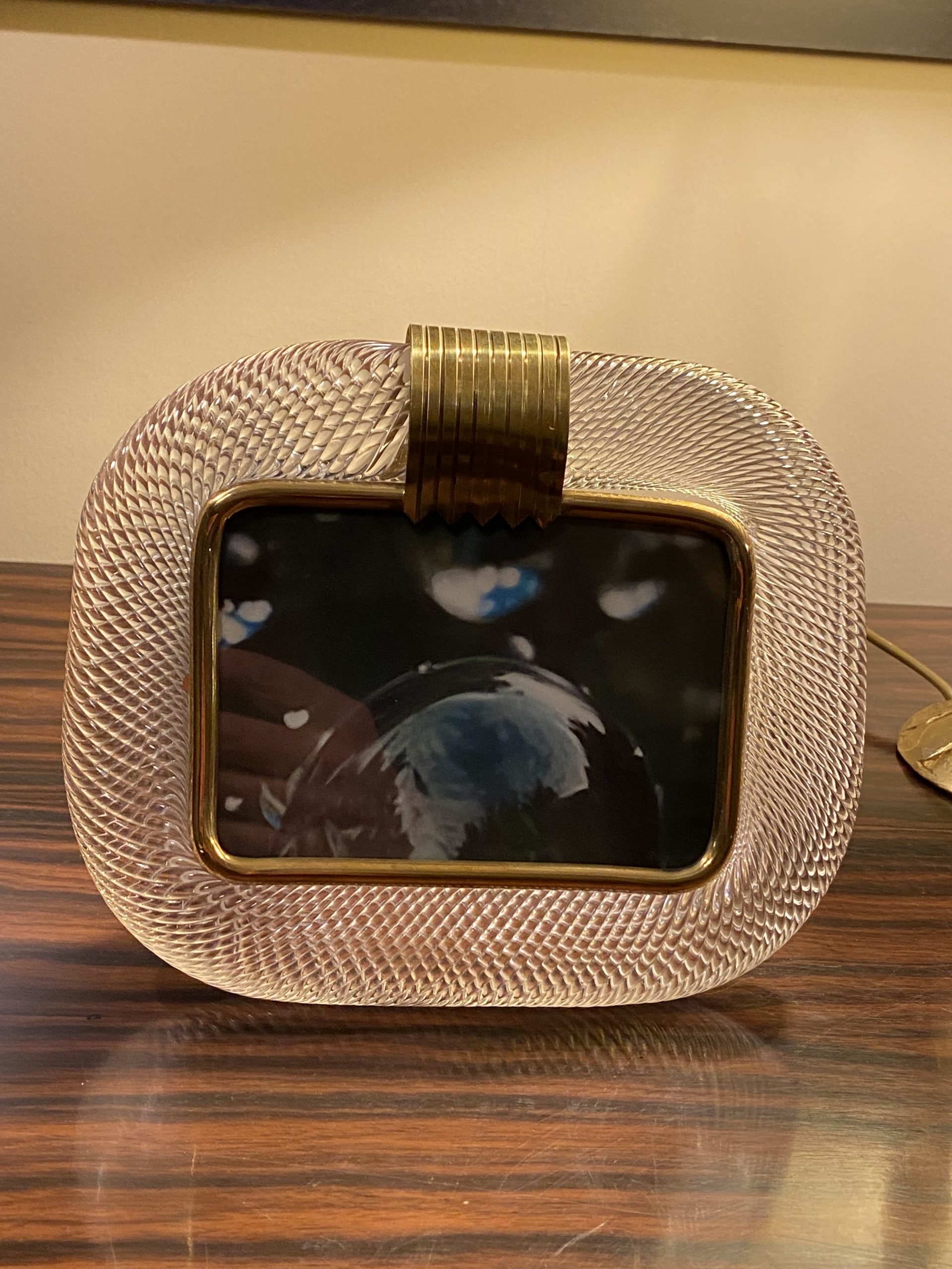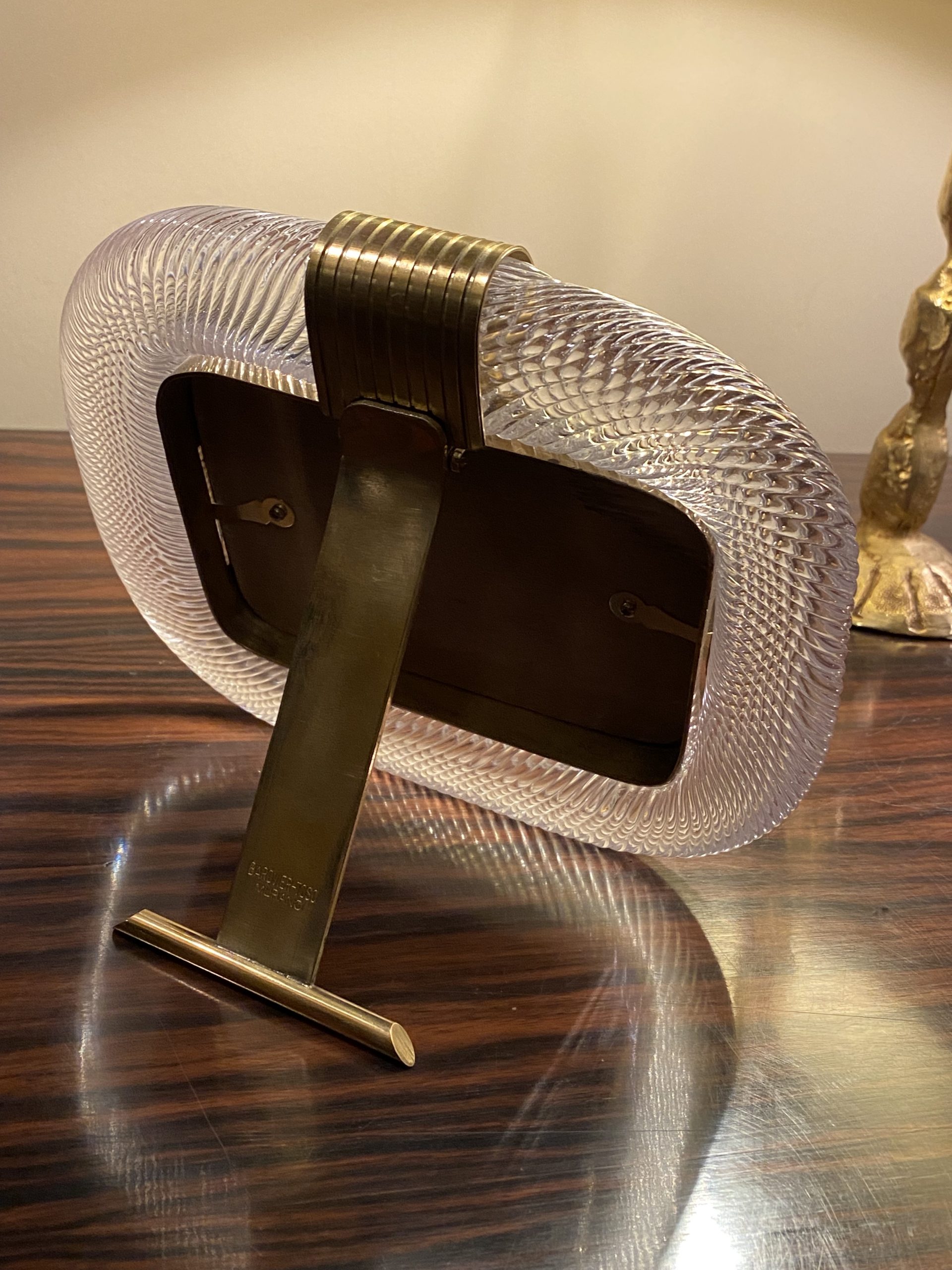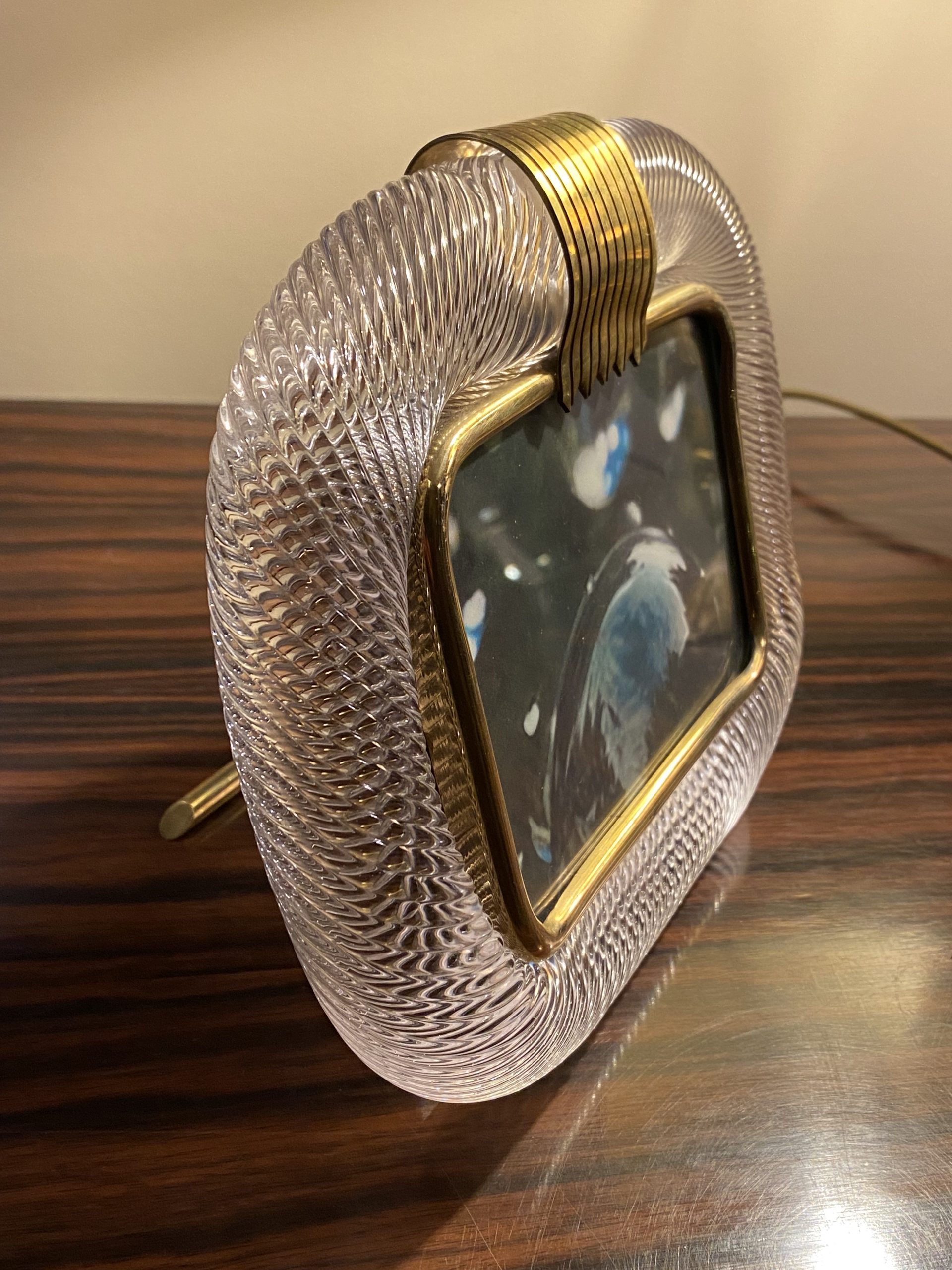 Elegant picture frame, produced by Barovier & Toso, Italy, circa 1950, Murano, mouth-blown transparent light rosé, Murano glass, brass, brass frame, folding brass stand, signed, wooden base, glass, very good condition, no scratches or damage, dimensions: height 20 x width 18 x depth 12 cm, thickness of the glass frame approximately 3 cm, inner dimensions: height 12 cm x width 9 cm.