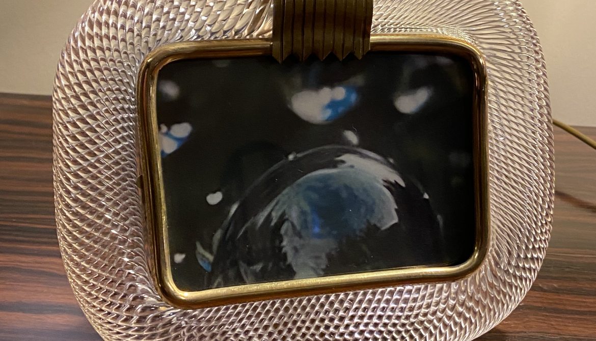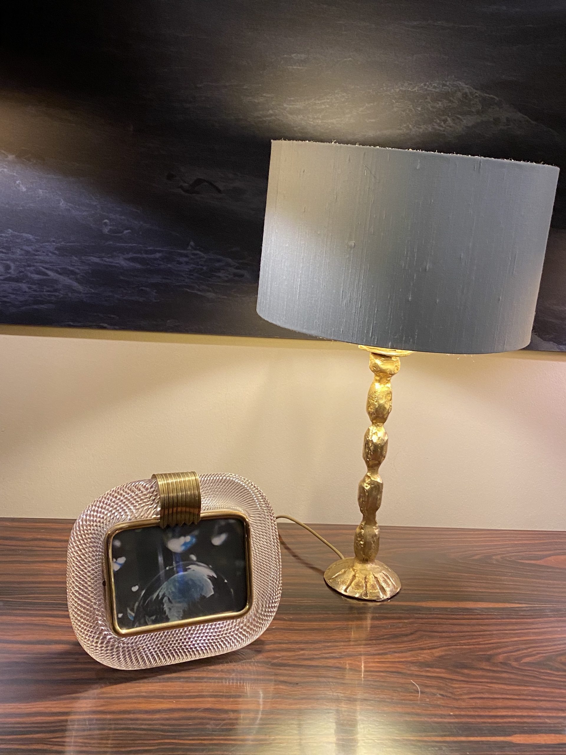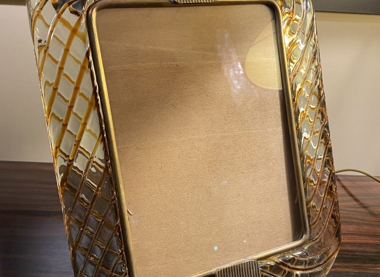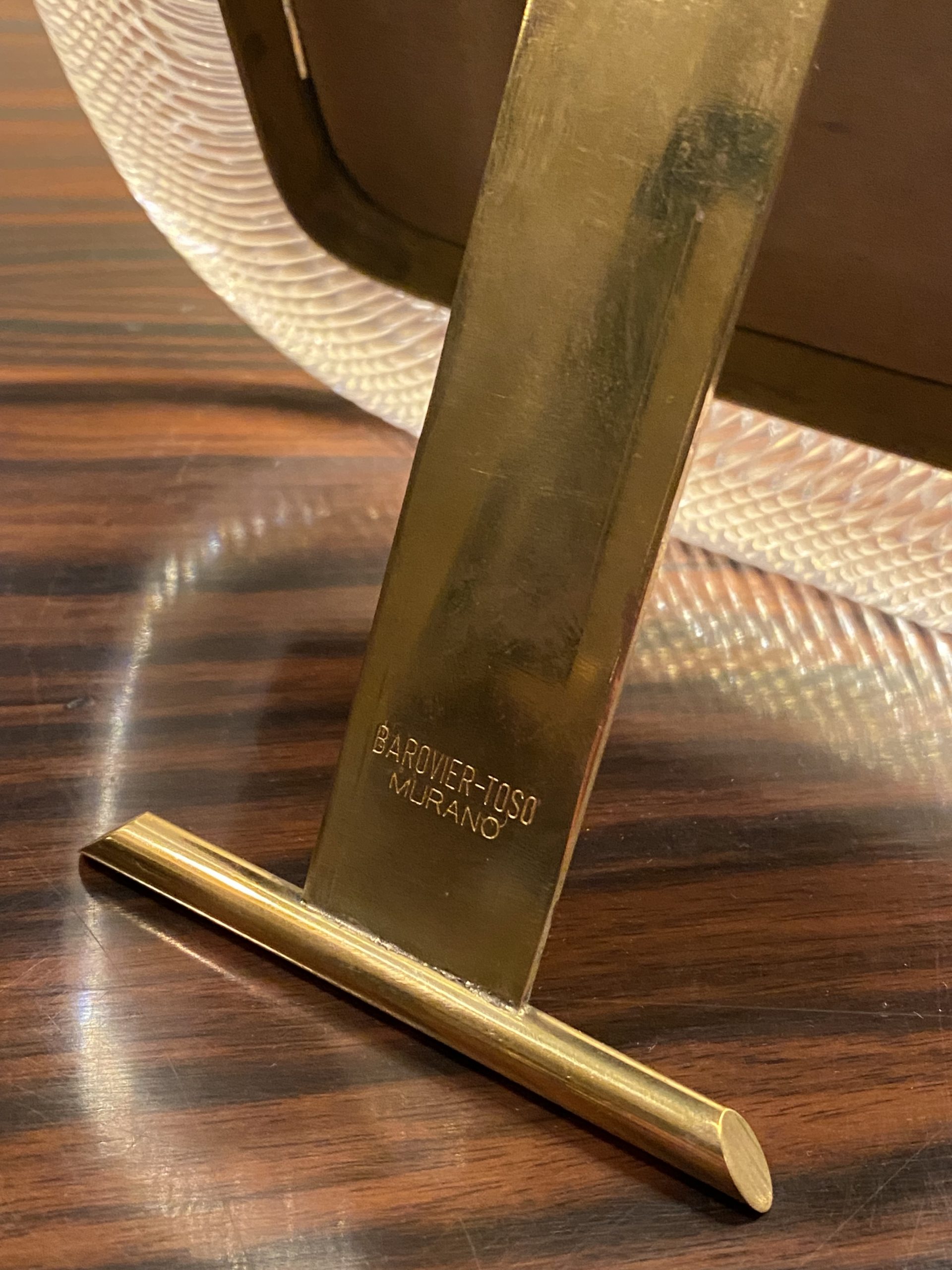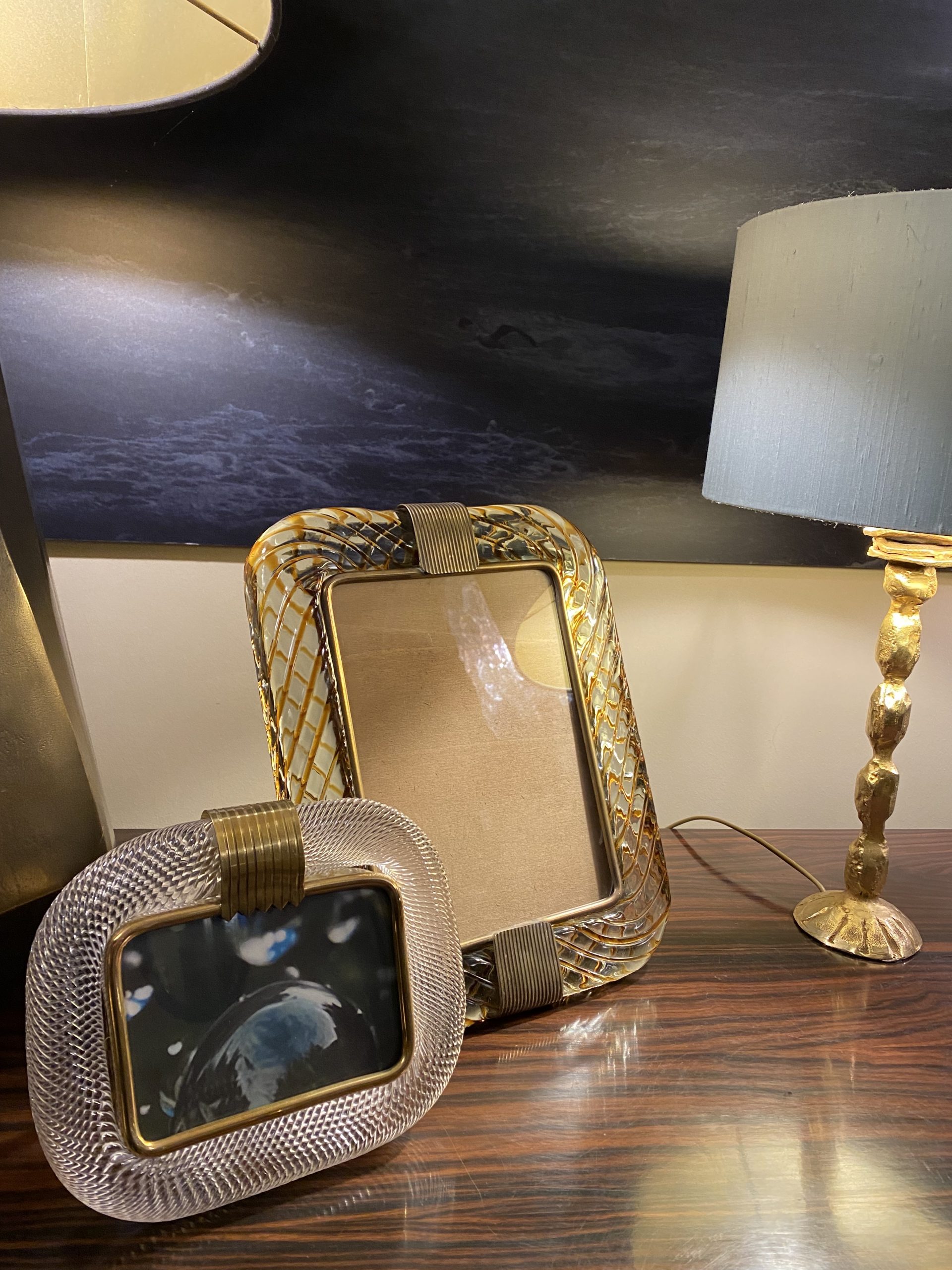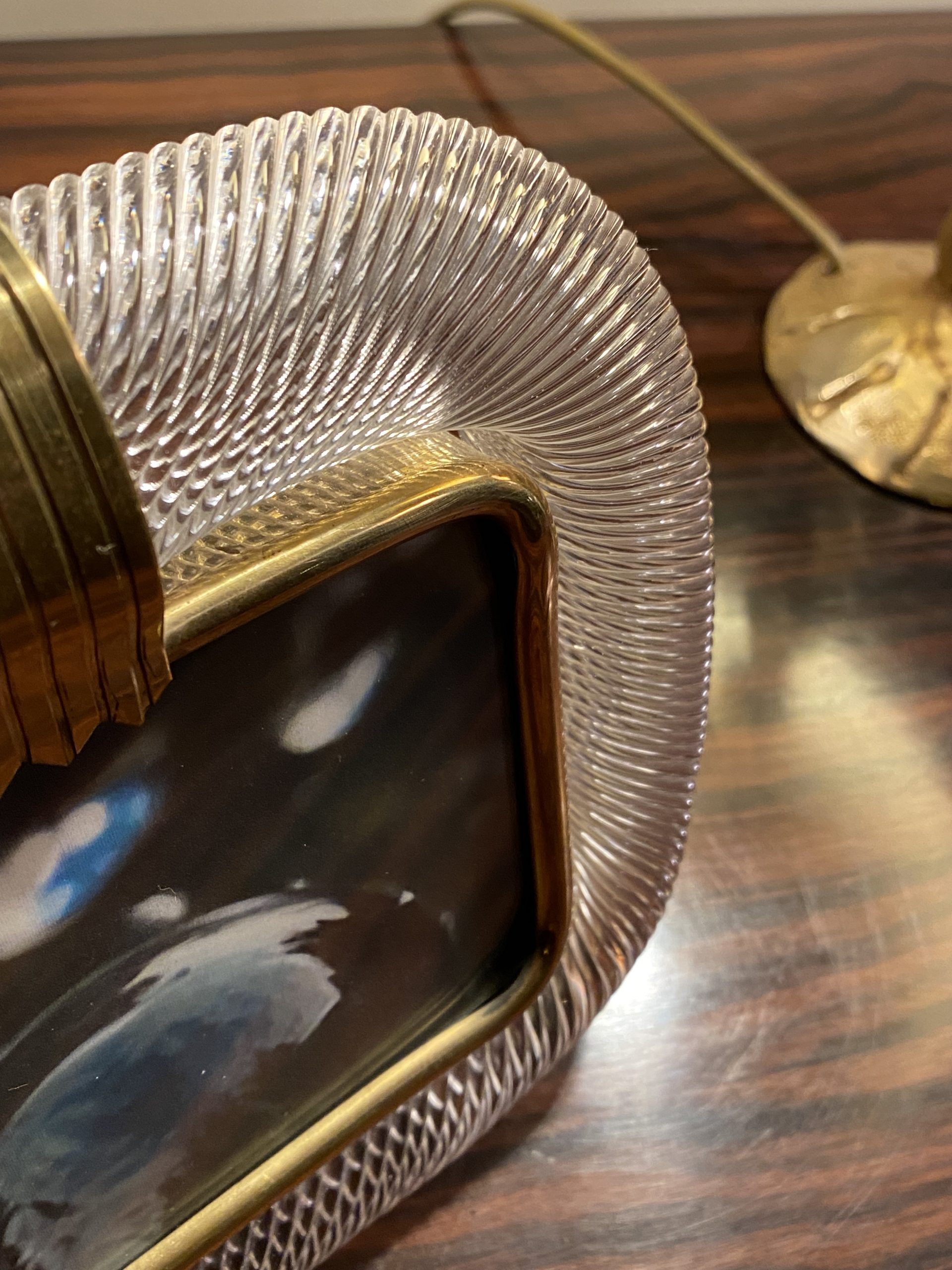 Elegant picture frame, produced by Barovier & Toso, Italy, circa 1950, Murano, mouth-blown transparent light rosé, Murano glass, brass, brass frame, folding brass stand, signed, wooden base, glass, very good condition, no scratches or damage, dimensions: height 20 x width 18 x depth 12 cm, thickness of the glass frame approximately 3 cm, inner dimensions: height 12 cm x width 9 cm.