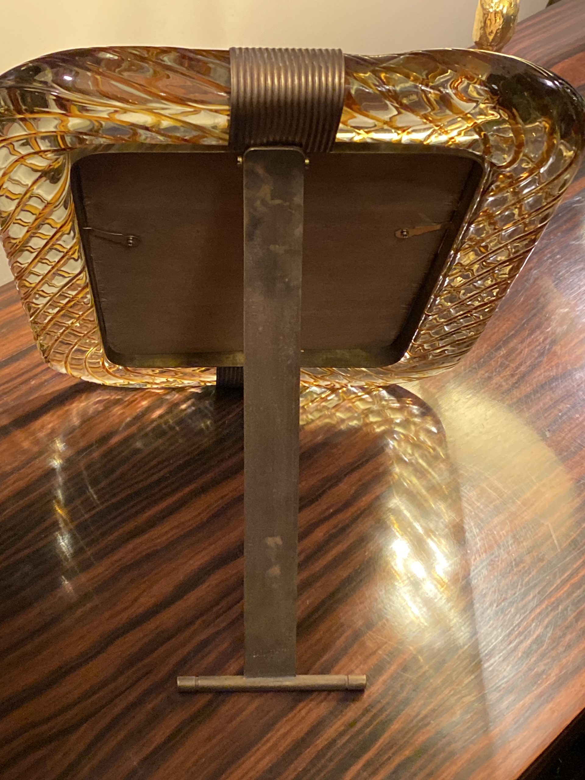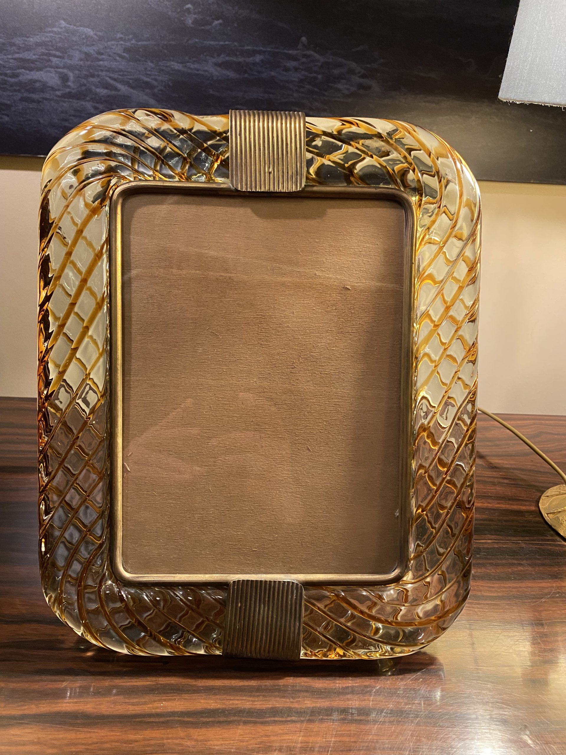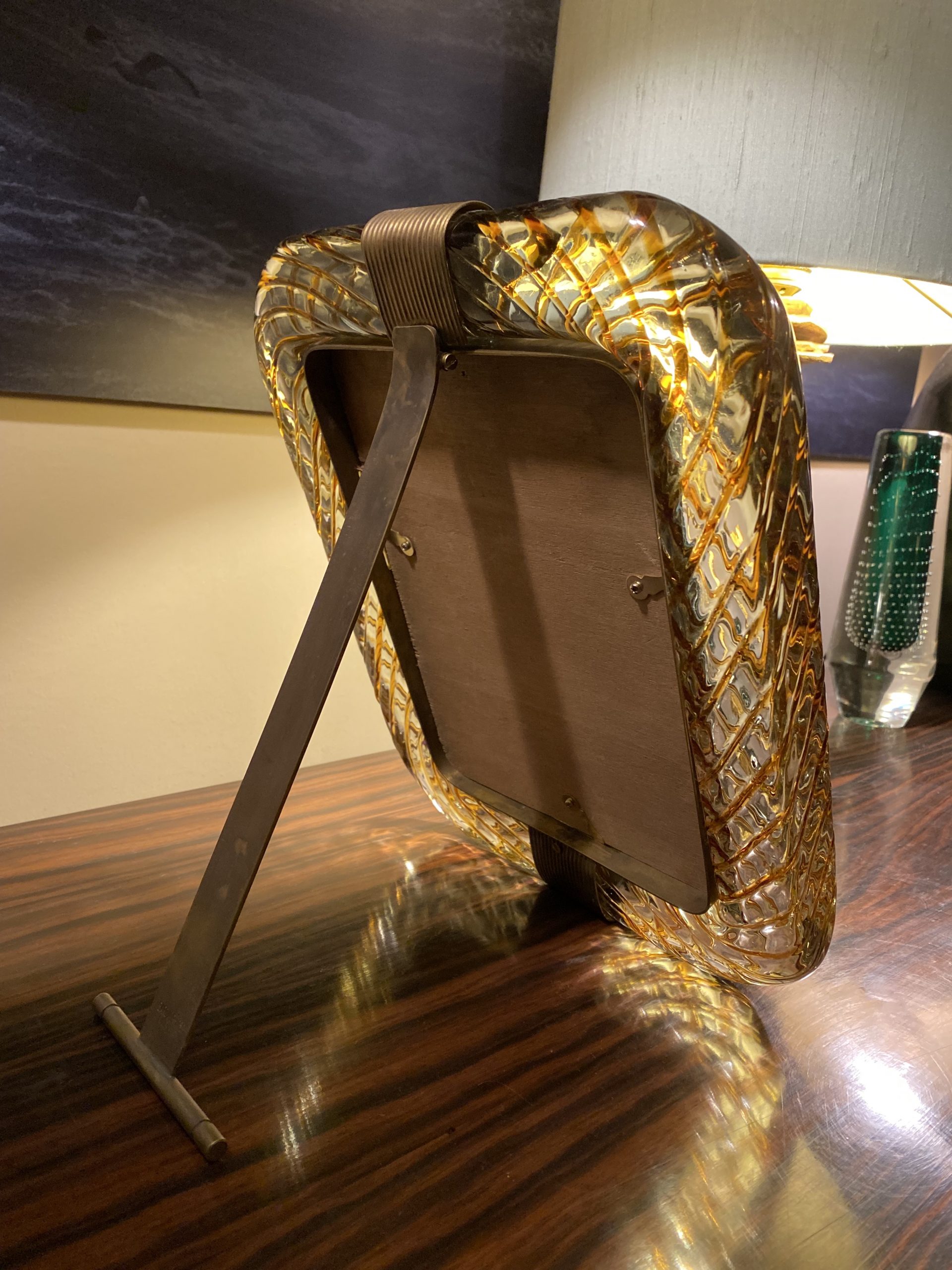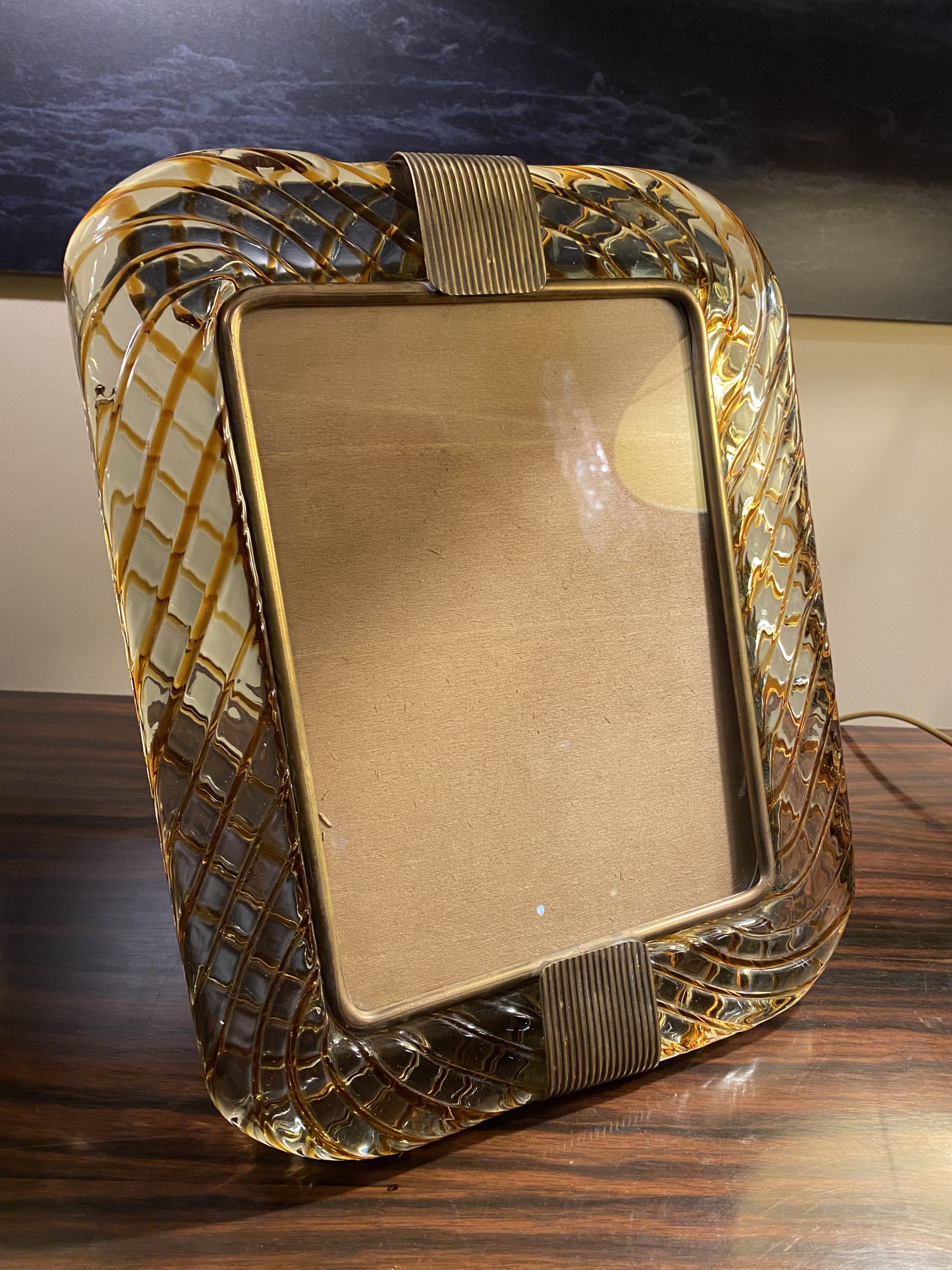 Large picture frame, produced by Barovier & Toso, Italy, circa 1960, Murano glass, brass, thick mouth-blown Murano glass, transparent and amber/golden brown, brass frame, brass stand signed at the bottom, wooden base, glass, very good, undamaged condition, no chips or scratches. Glass thickness approx. 3 cm, height 32 cm, width 24 cm, depth (with brass stand) 22 cm, internal dimensions: height 22 cm, width 16 cm.
