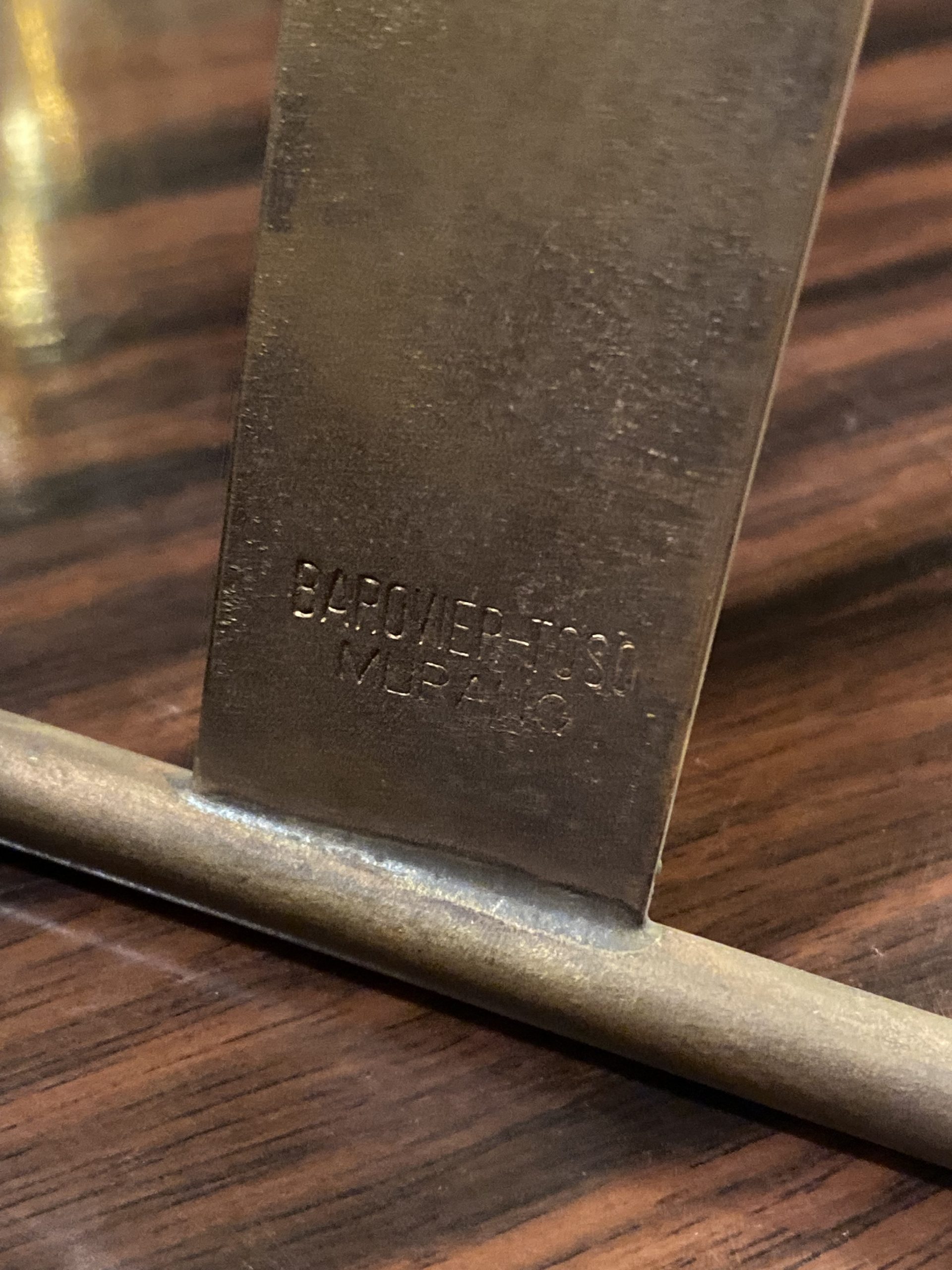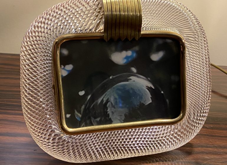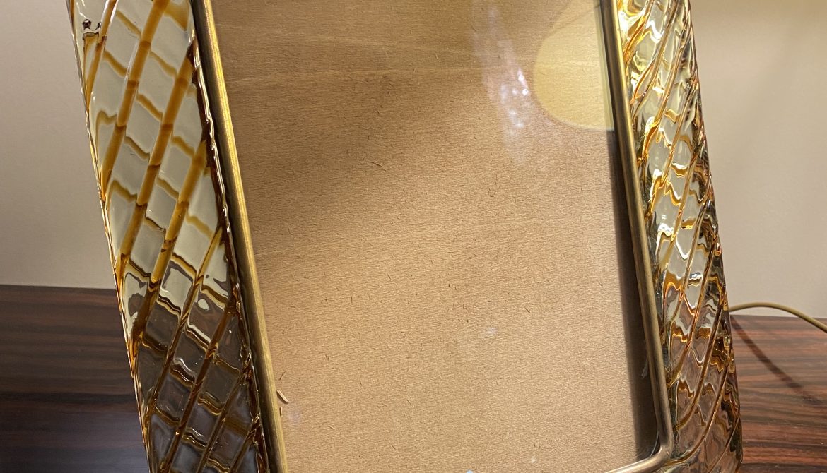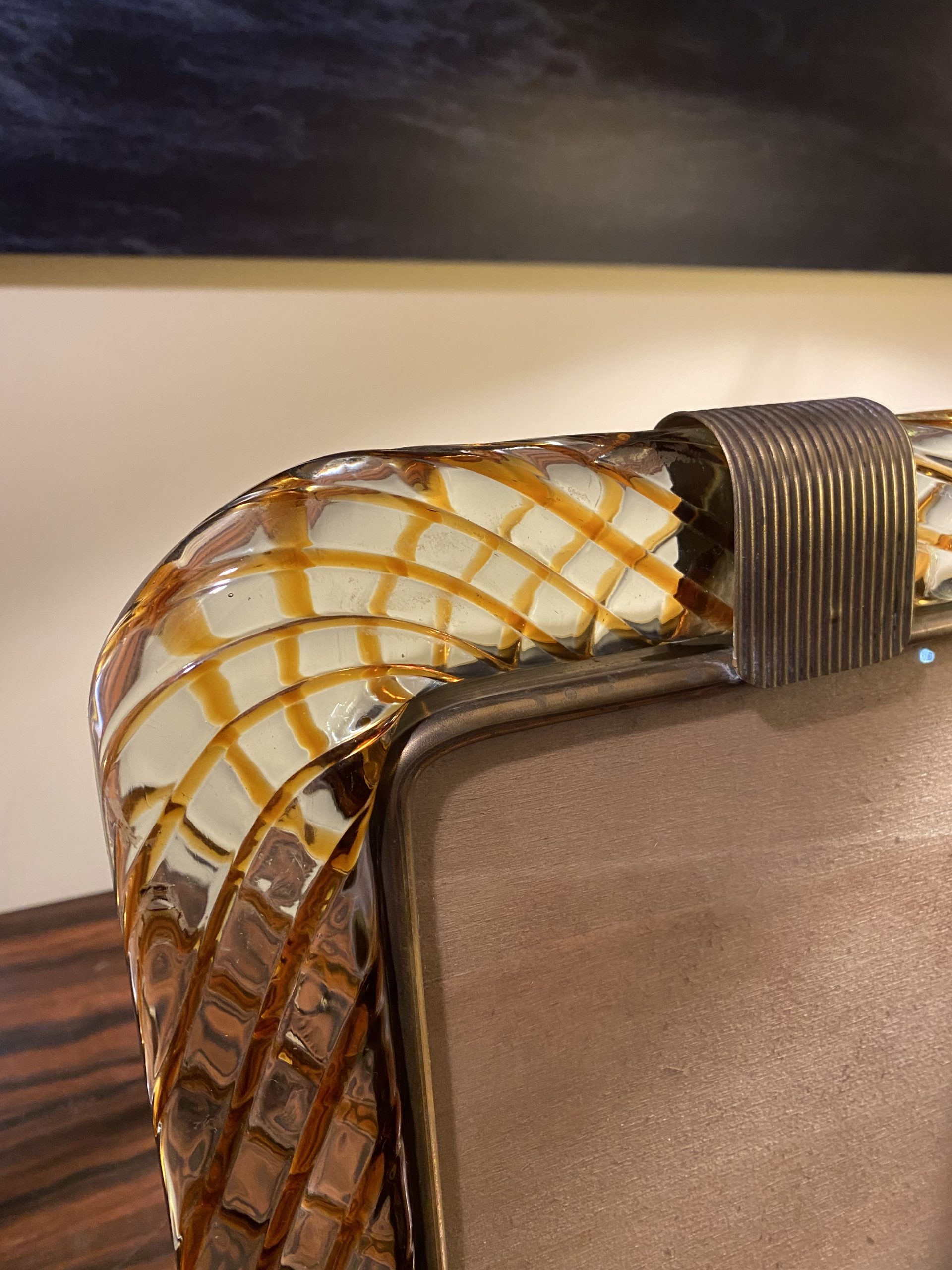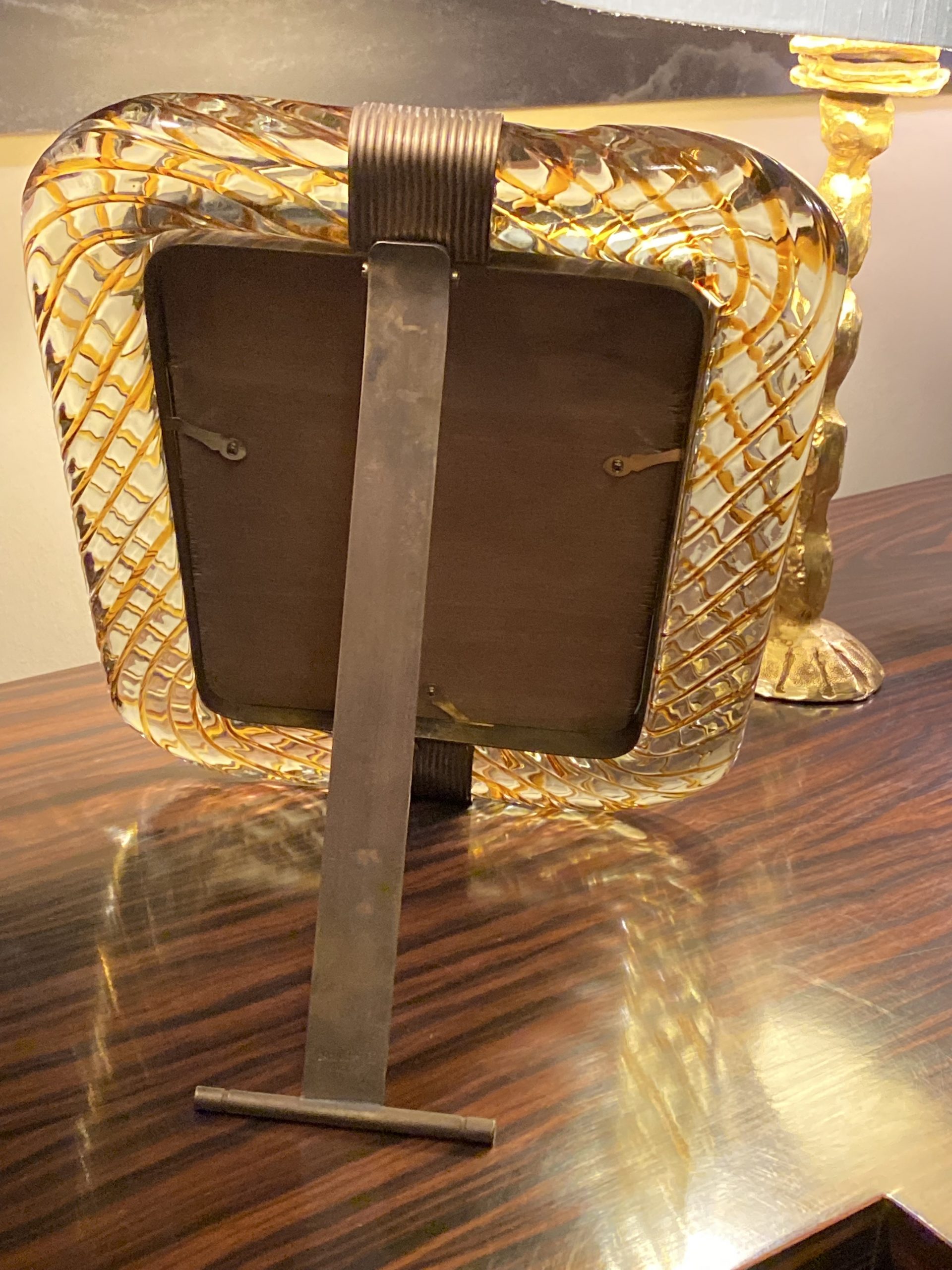 Large picture frame, produced by Barovier & Toso, Italy, circa 1960, Murano glass, brass, thick mouth-blown Murano glass, transparent and amber/golden brown, brass frame, brass stand signed at the bottom, wooden base, glass, very good, undamaged condition, no chips or scratches. Glass thickness approx. 3 cm, height 32 cm, width 24 cm, depth (with brass stand) 22 cm, internal dimensions: height 22 cm, width 16 cm.