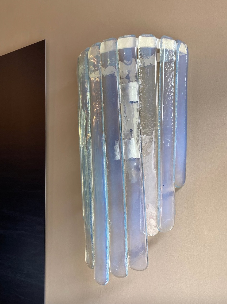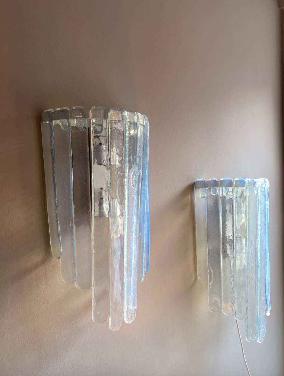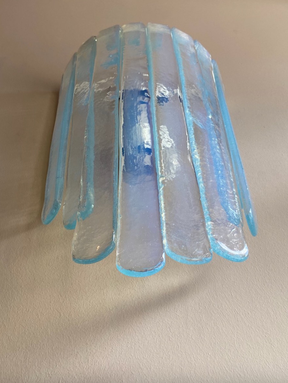 Large Pair of Wall lamps, by Carlo Nason, Prod. AV Mazzega, Murano Italy, circa 1970, height 63x width 35x 16 cm depth, chromed metal, iridescent Murano glass with blue reflections.