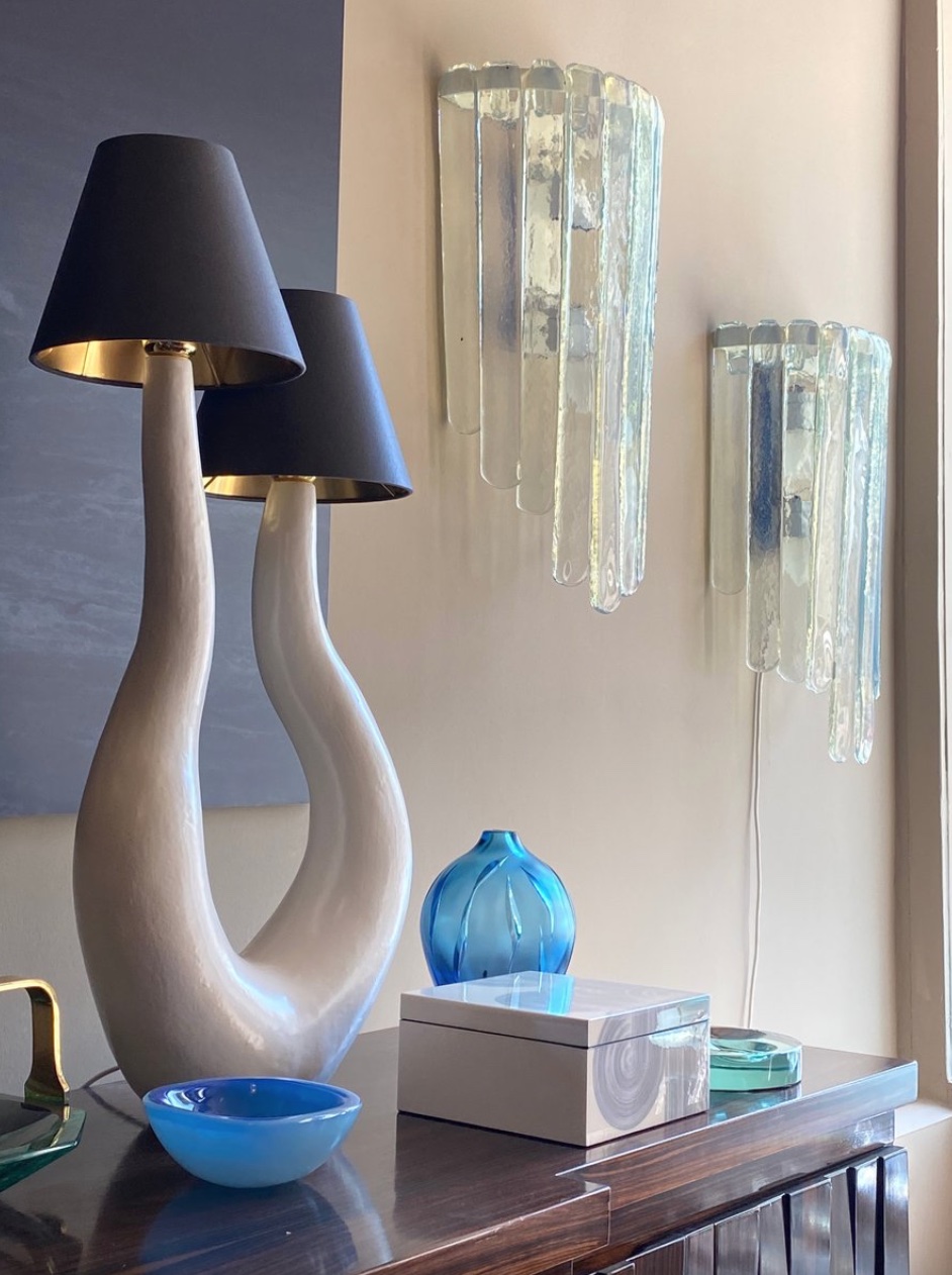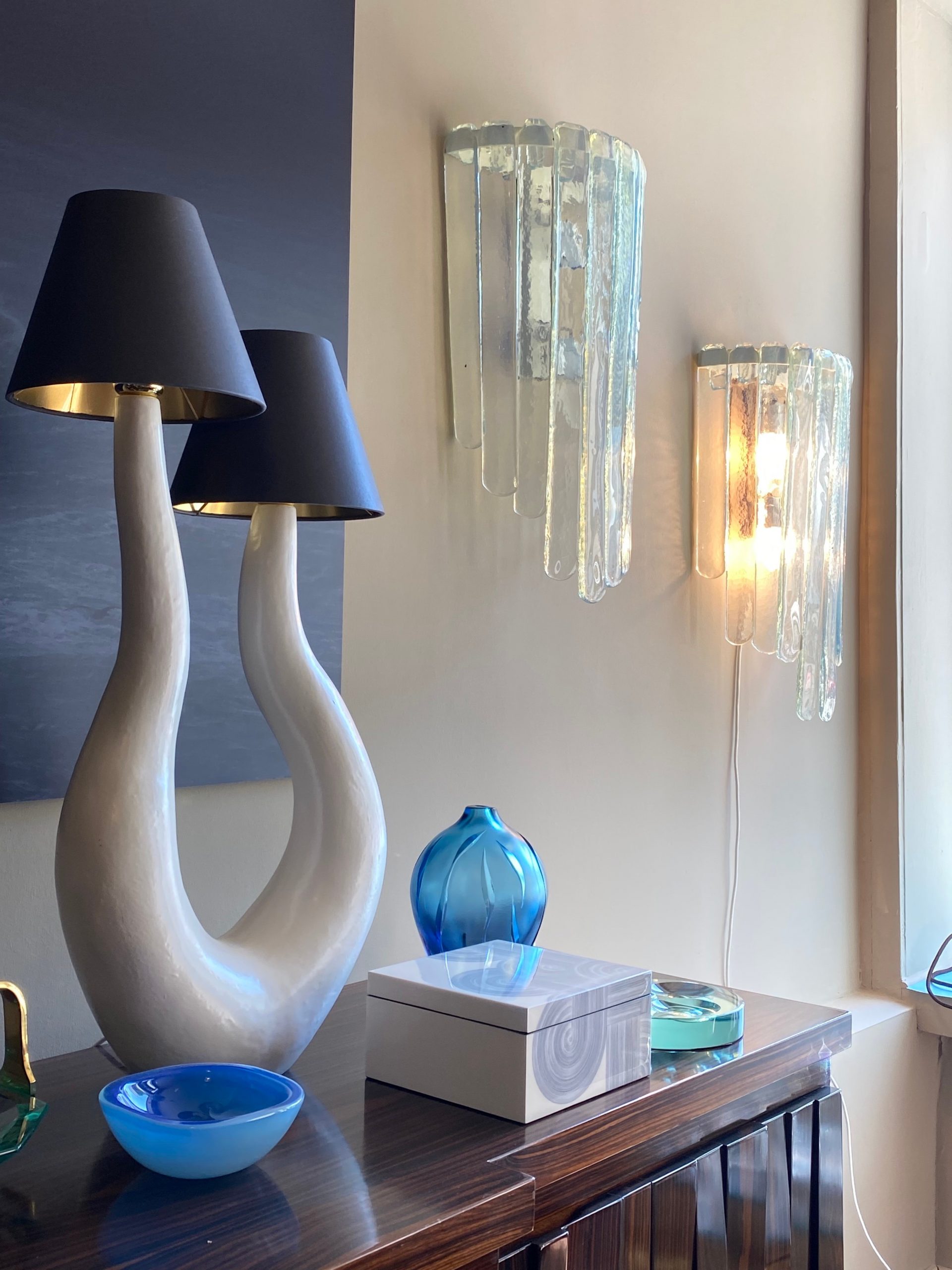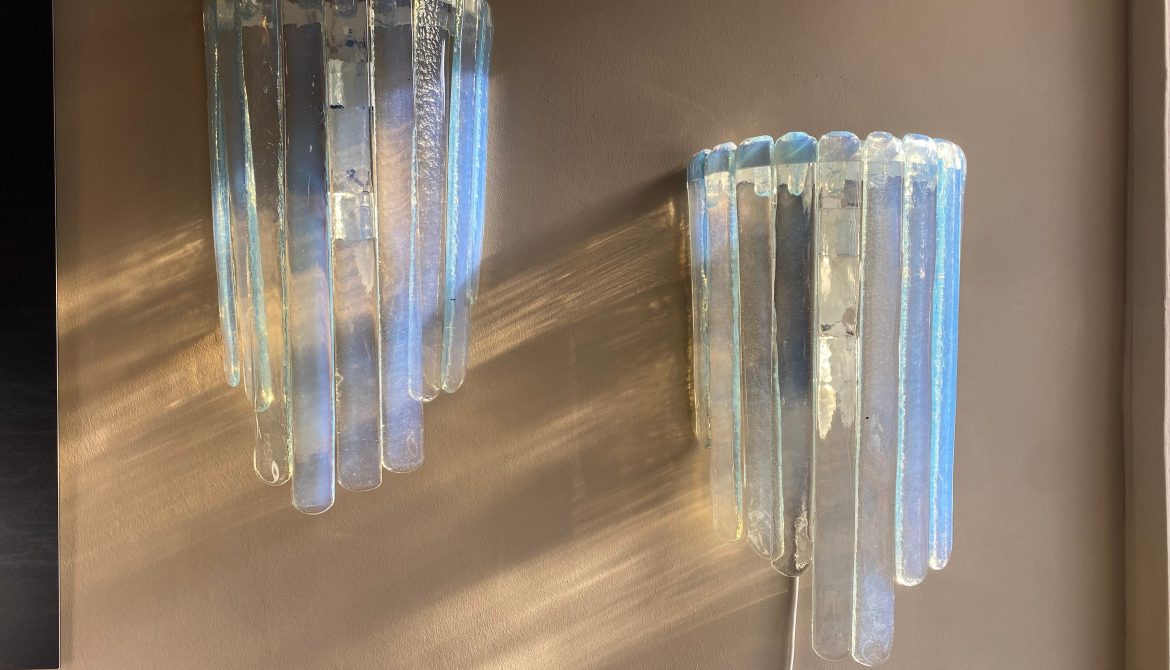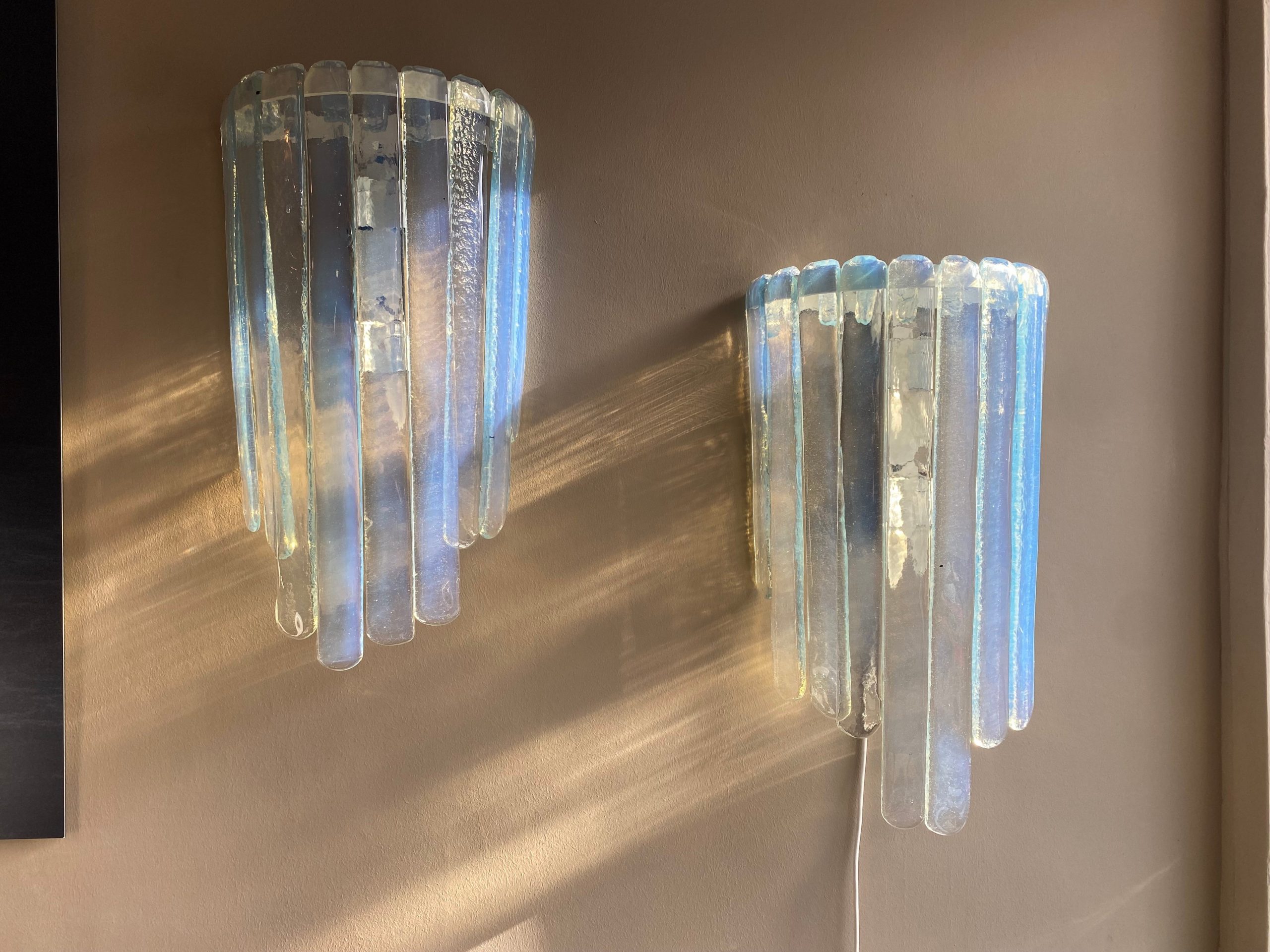 Large Pair of Wall lamps, by Carlo Nason, Prod. AV Mazzega, Murano Italy, circa 1970, height 63x width 35x 16 cm depth, chromed metal, iridescent Murano glass with blue reflections.